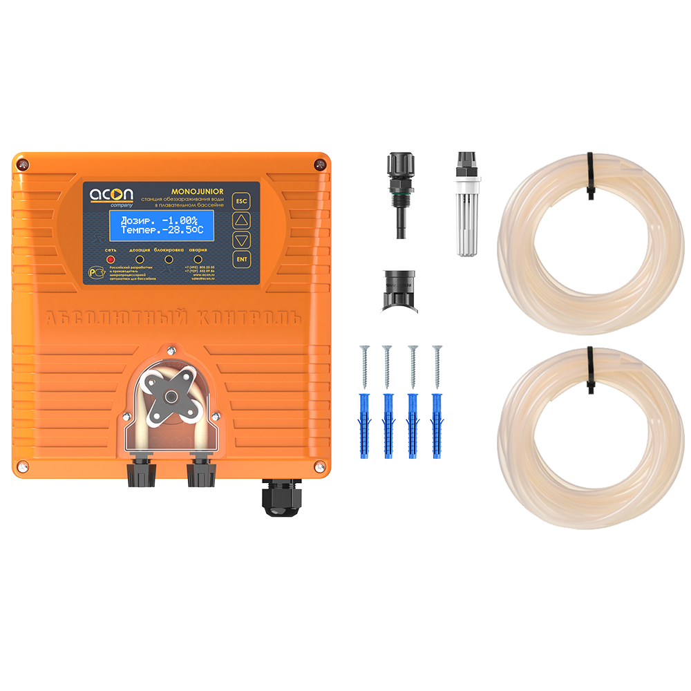 Характеристики Класс защиты IP56 Напряжение питания 220 В ± 10% Максимальное потребление мощности 50 Вт Тип дозирующих насосов Перистальтический Максимальная производительность дозирующего насоса 2.2 л/ч Материал трубки перистальтического насоса Santoprene Количество дозирующих насосов 1 шт Минимальный объем бассейна 1 м³ Максимальный объем бассейна (частный) 250 м³ Максимальный объем бассейна (общественный) 150 м³ Температура окружающего воздуха +5÷35?С Влажность окружающего воздуха Не более 75% -