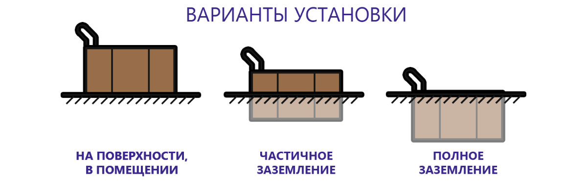 - - 3 варианта установки (поверхности, частично заземленный, заземленный)
